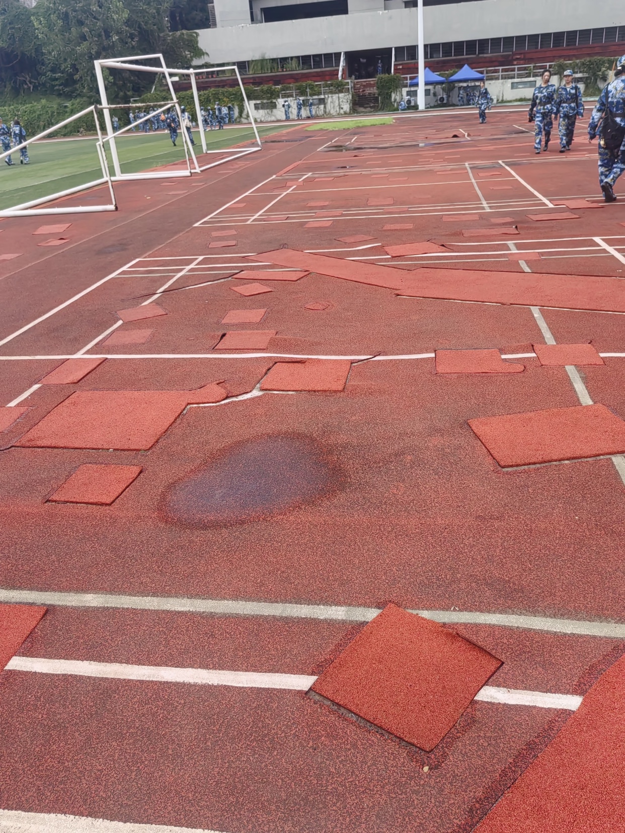 中度损坏:出现较大面积的磨损、脱粒现象,跑道的弹性有所下降,部分区域可能出现裂缝。这可能是因为使用年限较长、维护不当或者受到恶劣天气的影响。